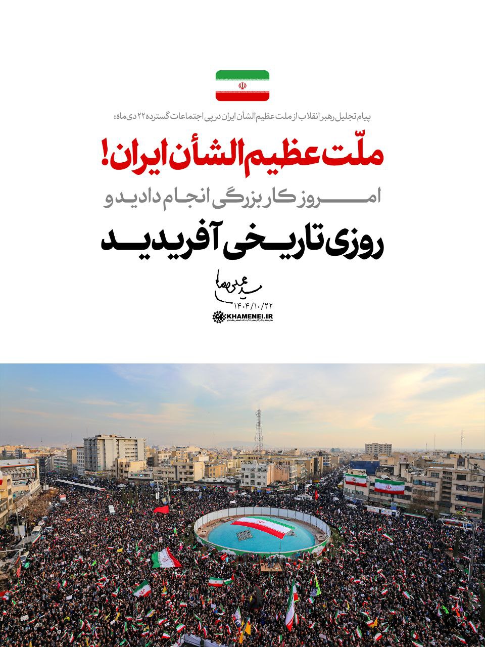 حضرت آیت الله خامنه ای رهبر معظم انقلاب اسلامی در پیامی  از اجتماعات گسترده روز دوشنبه 22 دی ماه ملت ایران در محکومیت اقدامات تخریبگران و اعلام انزجار نسبت به جنایات تروریستها مسلح فرمودند : امروز 22 دی ماه 1404 روزی تاریخی است که آفریده شد.